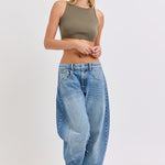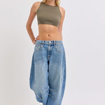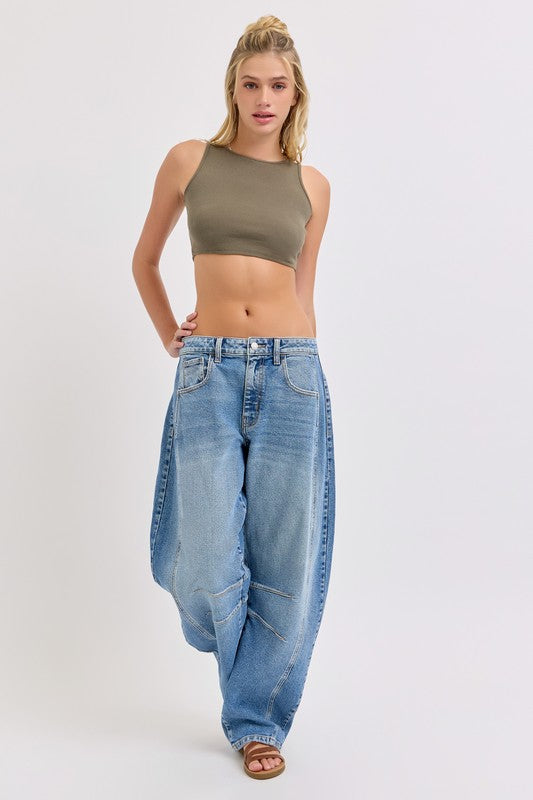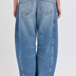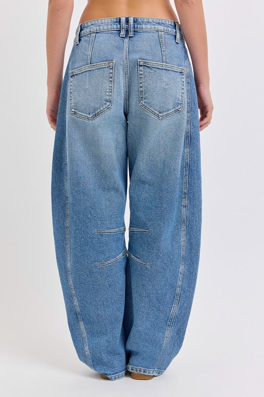 Meet your new favorite statement denim. The Barrel Fit Mid-Rise Jeans bring effortless edge with their relaxed silhouette and unique dart details, giving you that perfectly slouchy, lived-in vibe. Crafted in a medium wash, these jeans balance structure and comfort, making them a versatile staple for everyday wear. Designed with a mid-waist fit and long inseam, they elongate your frame while keeping things ultra laid-back.