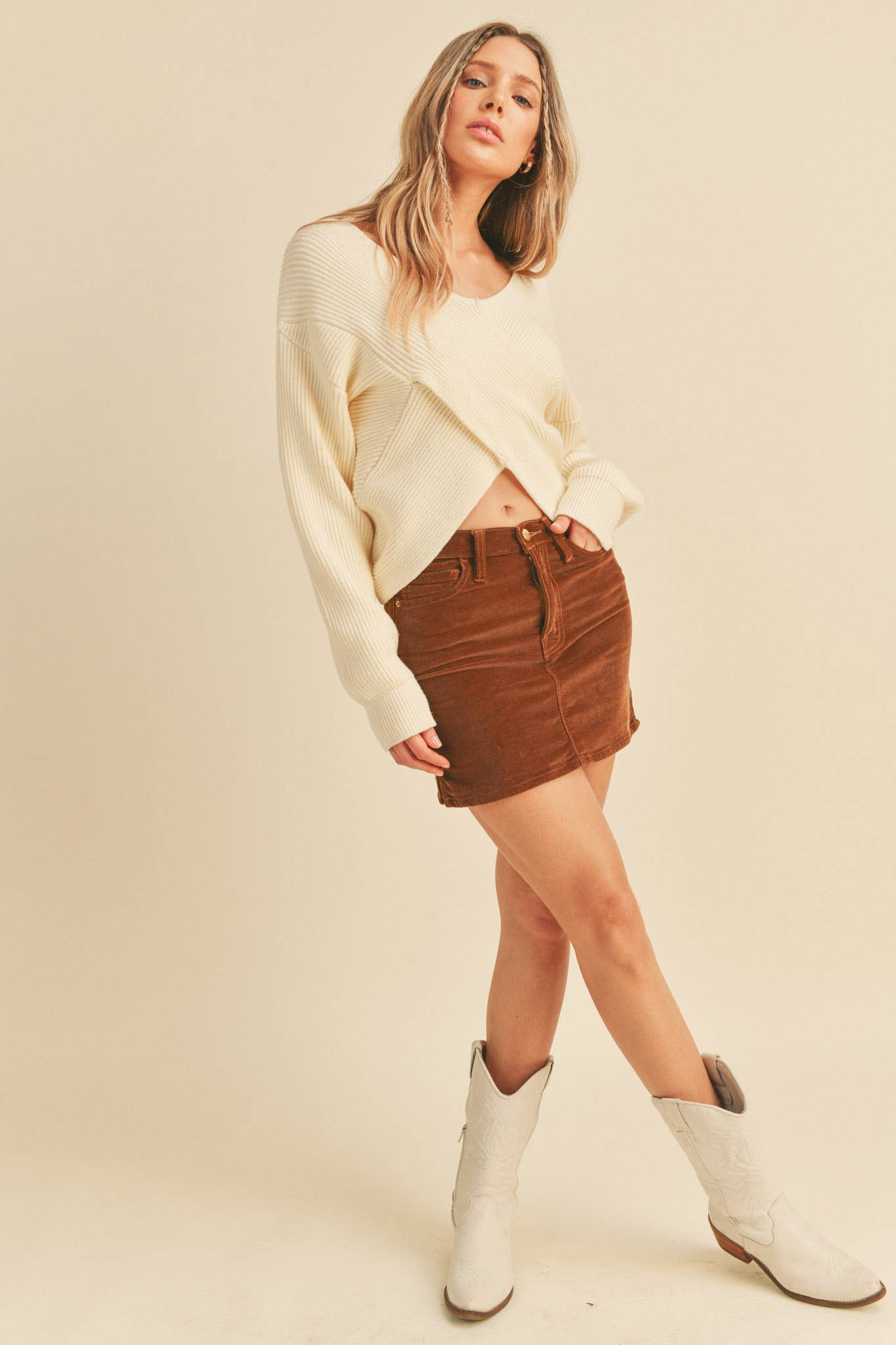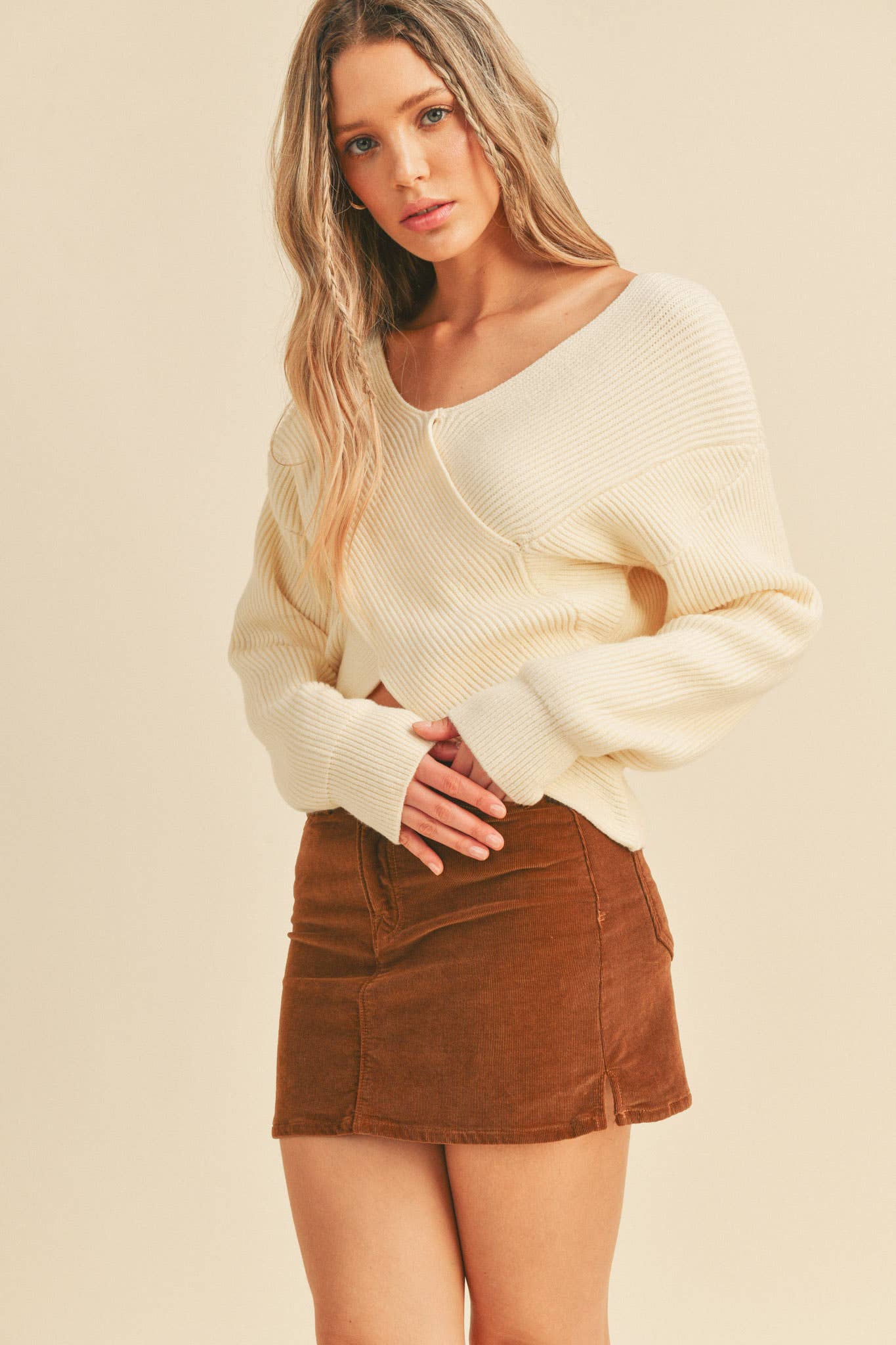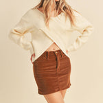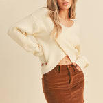 Meet your new wardrobe essential: the Crossroads Ivory Ribbed Sweater in ivory. Designed with a flattering surplice crossover front and ribbed knit texture, this sweater blends cozy comfort with effortless style, making it a versatile piece you’ll wear on repeat.