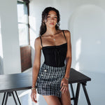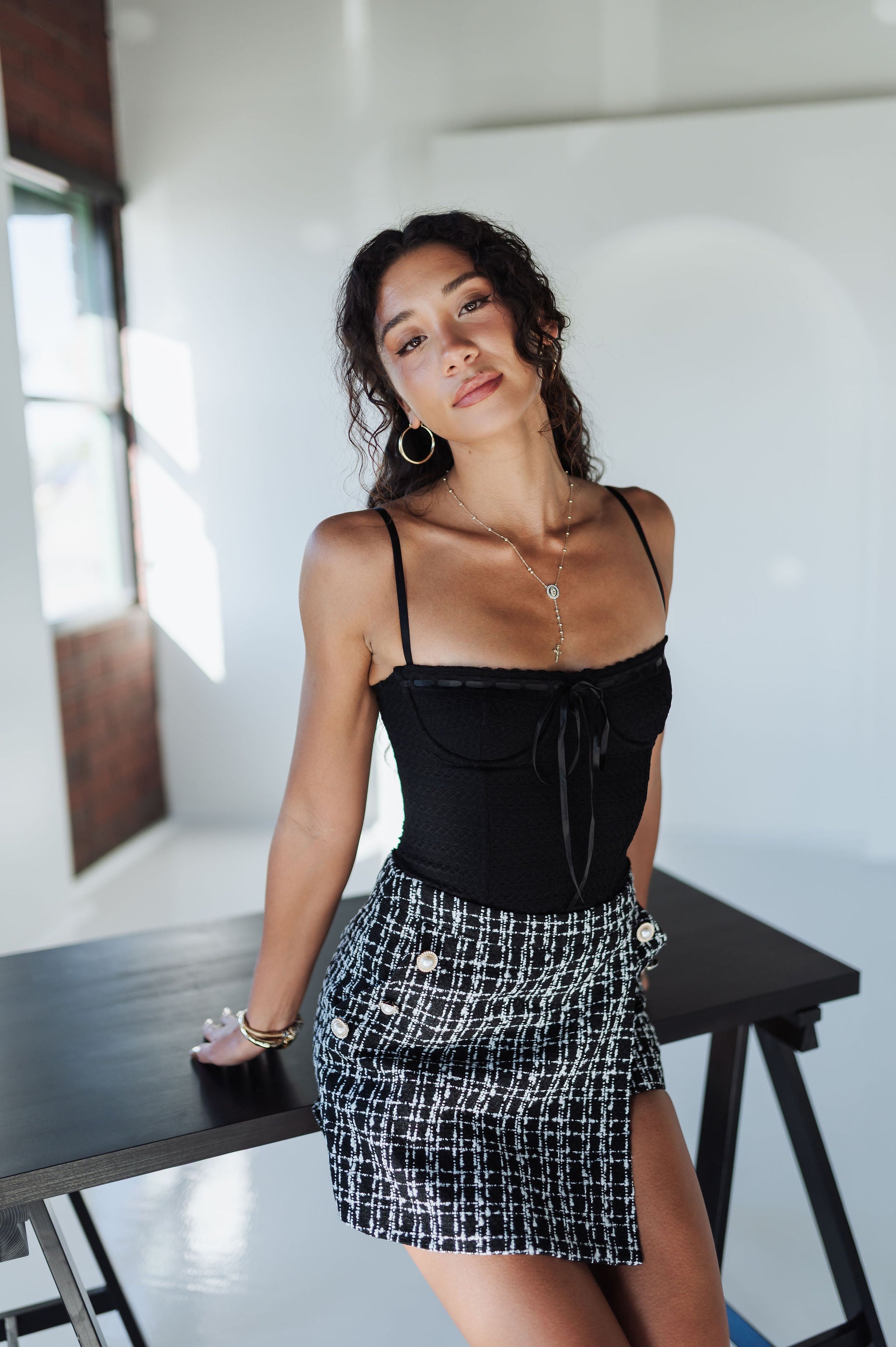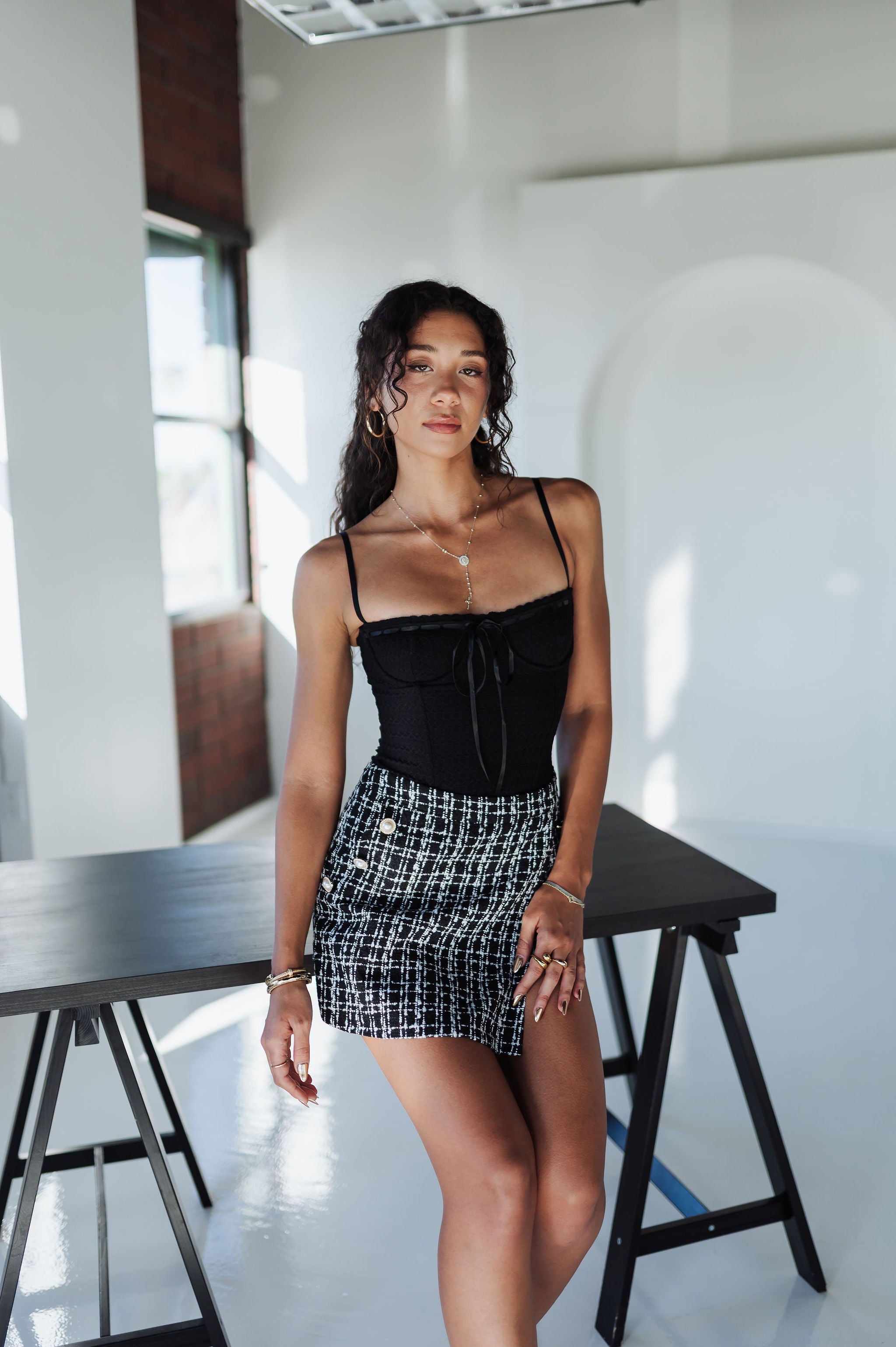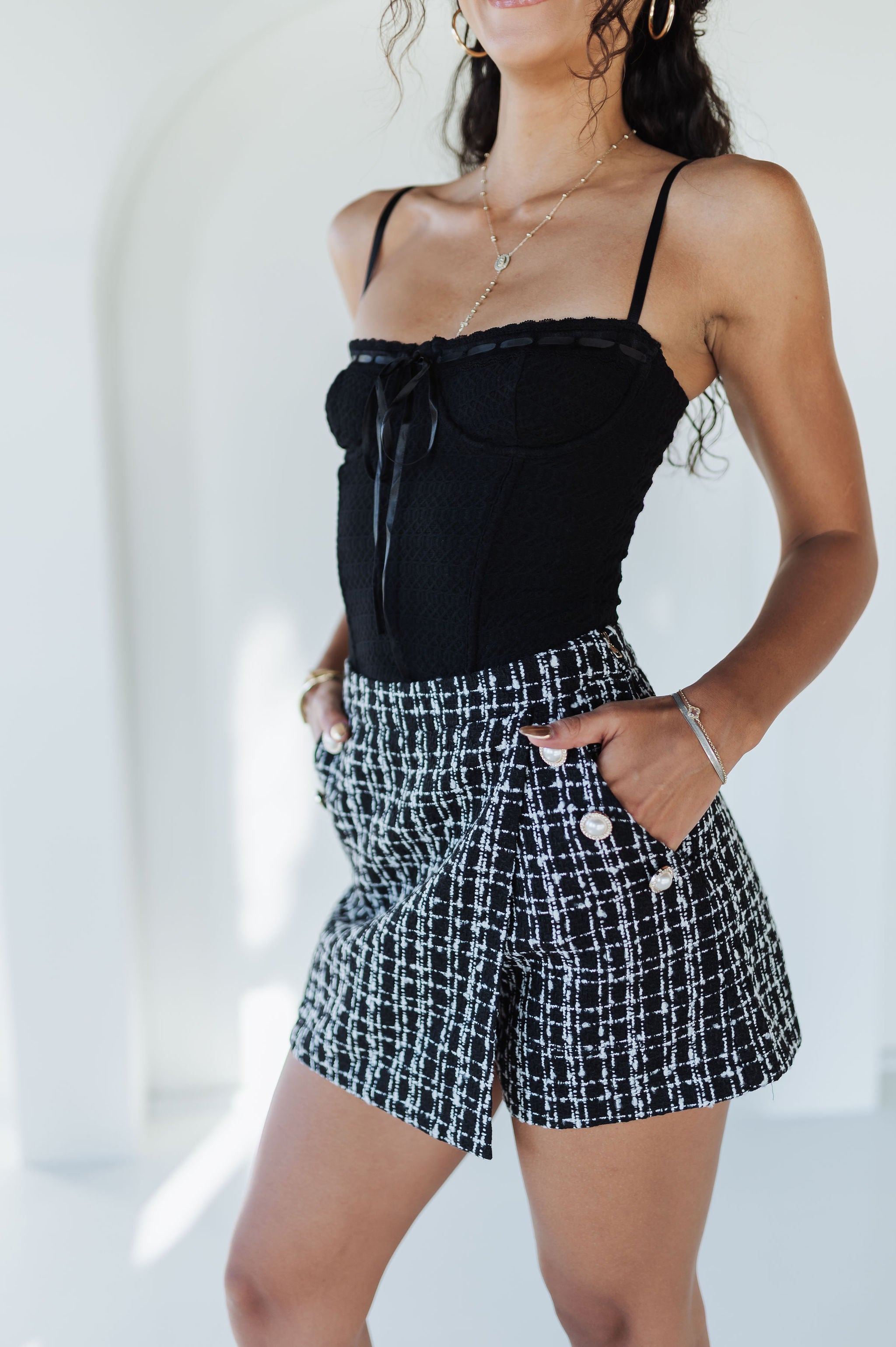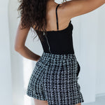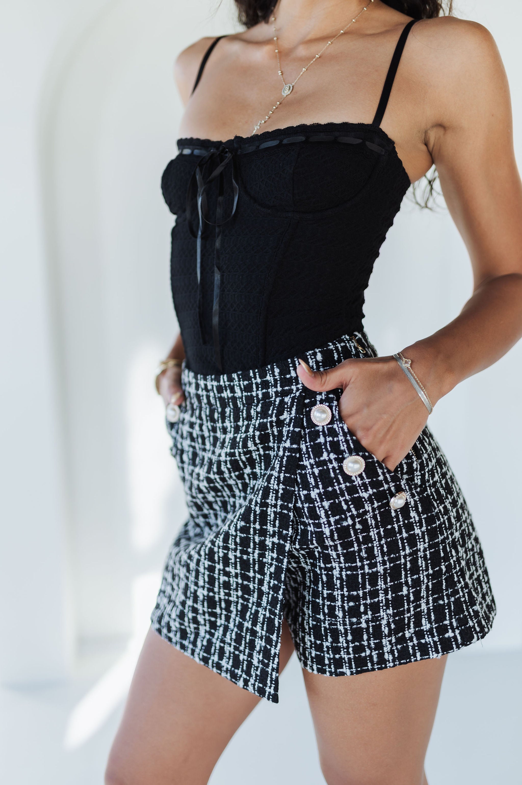 Bring polish and edge to your look with the Modern Muse Tweed Skort. Featuring a tailored tweed design with pearl button accents, this skort blends the chic look of a skirt with the comfort of shorts. A side zipper keeps the fit sleek, while the timeless black-and-white pattern makes it easy to dress up or down