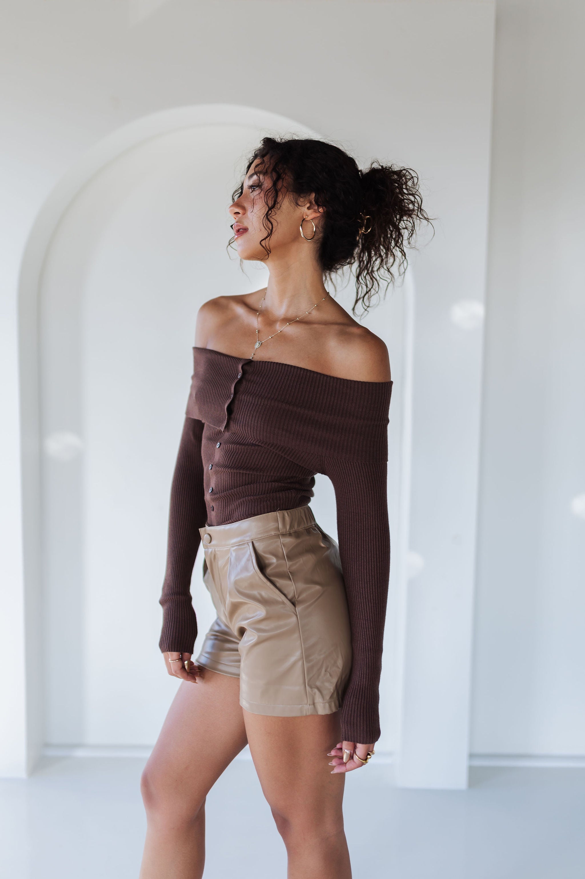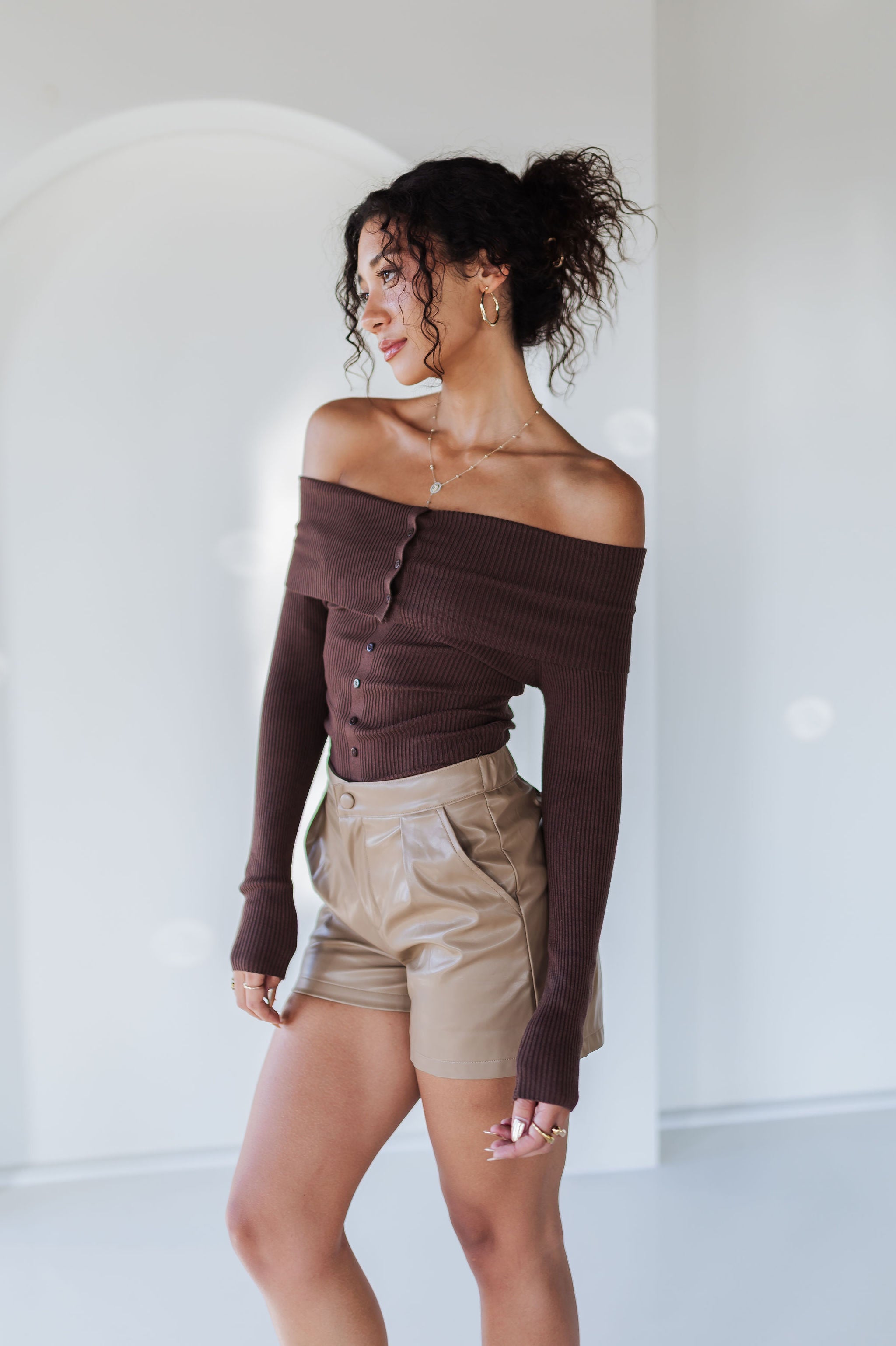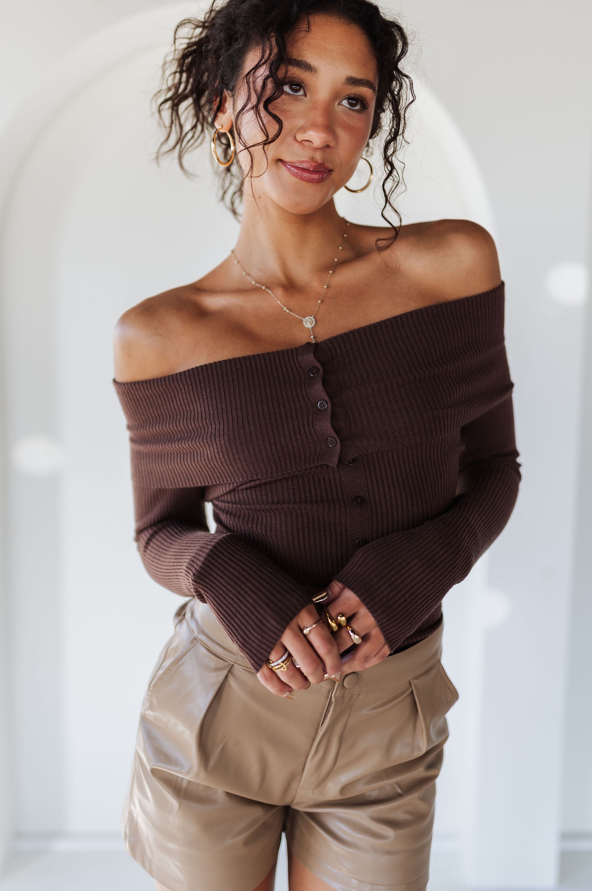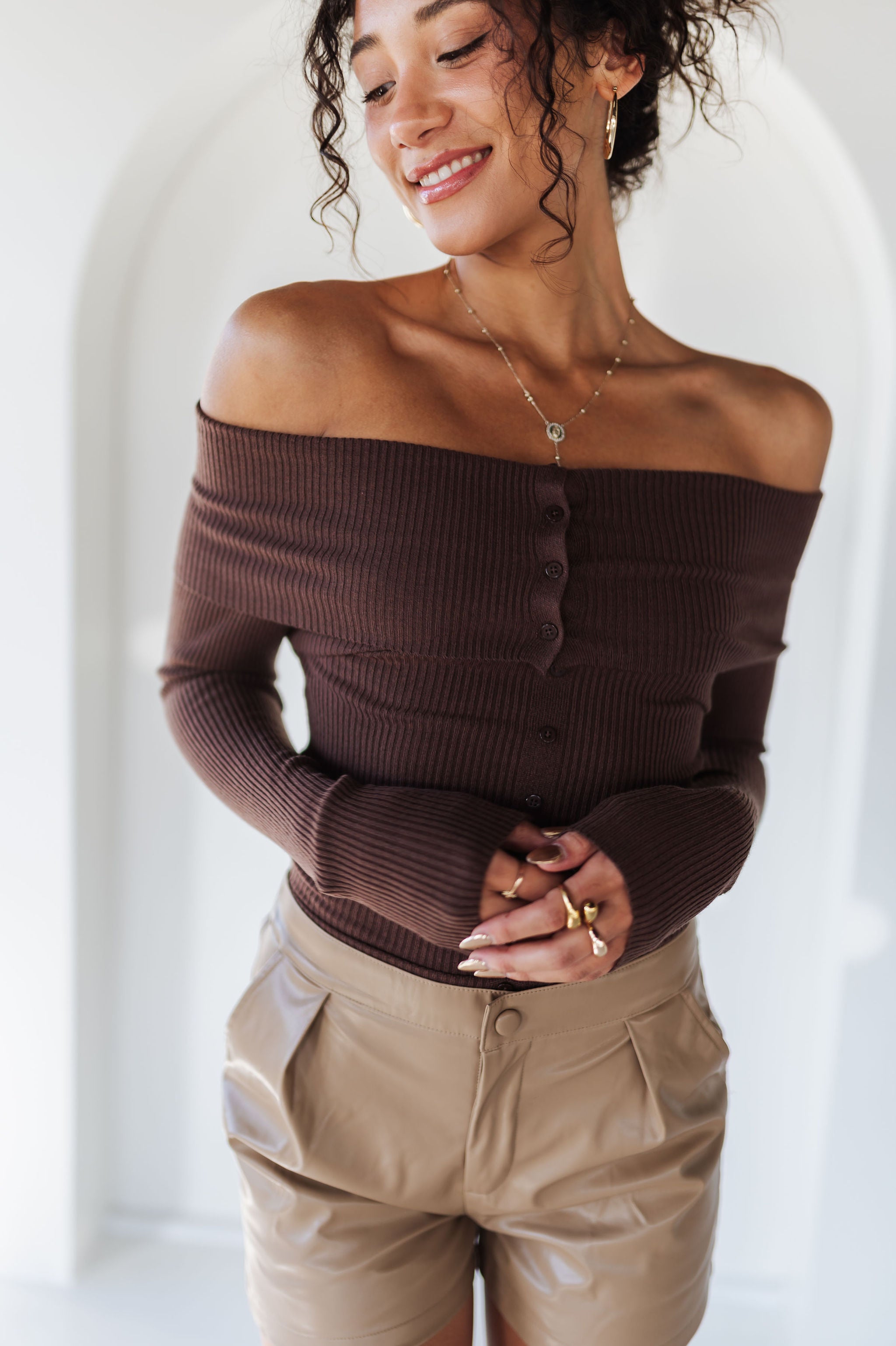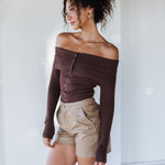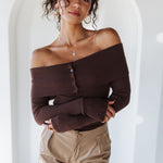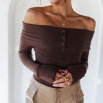 Flirty yet sophisticated, the Moonlit Kiss Ribbed Top is a wardrobe essential for every season. Designed with a foldover neckline, this slim-fit knit top highlights your shoulders while offering a sleek, flattering silhouette. The ribbed stretch fabric and faux button-front detail make it effortlessly chic for day-to-night styling.