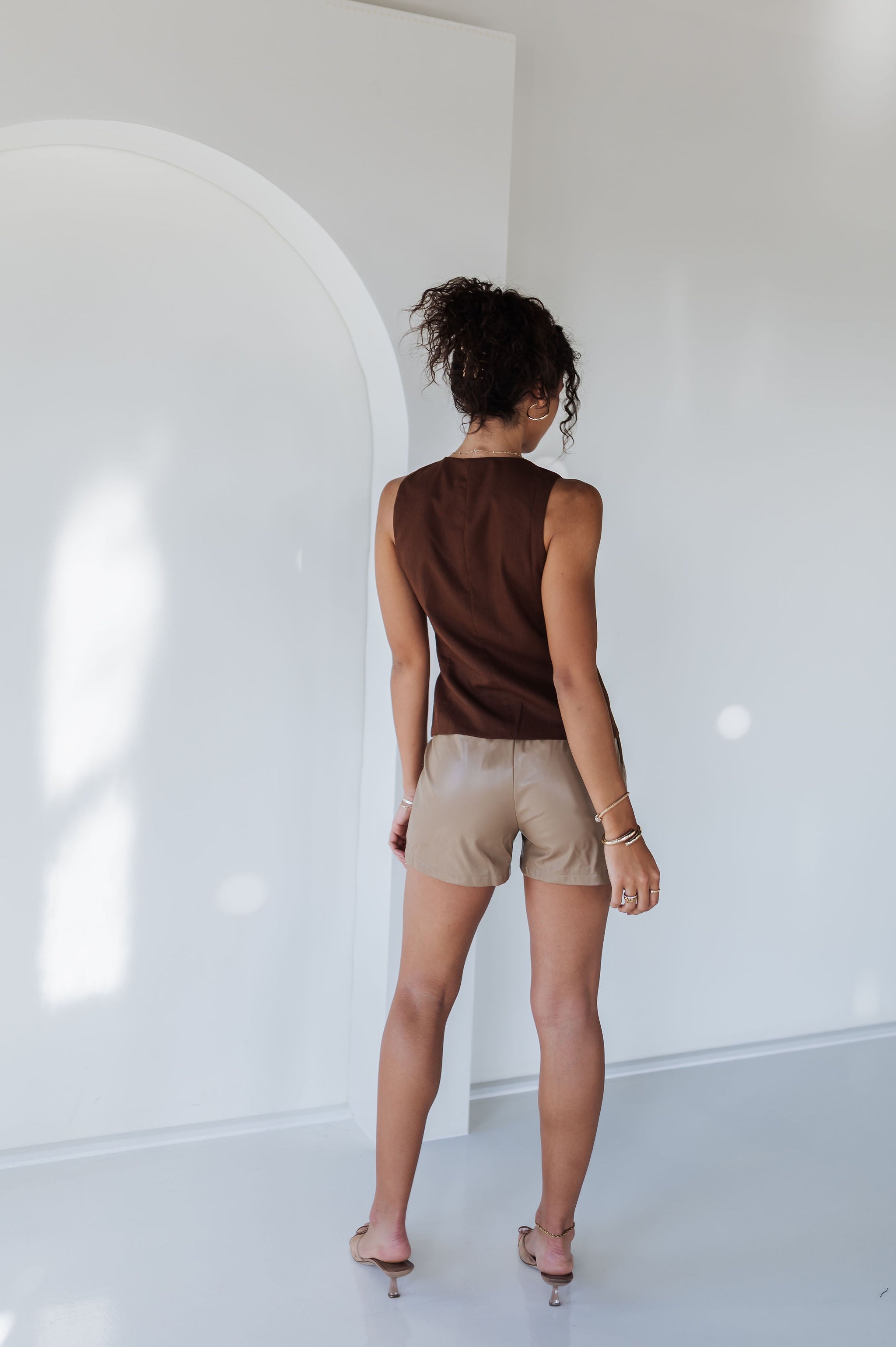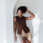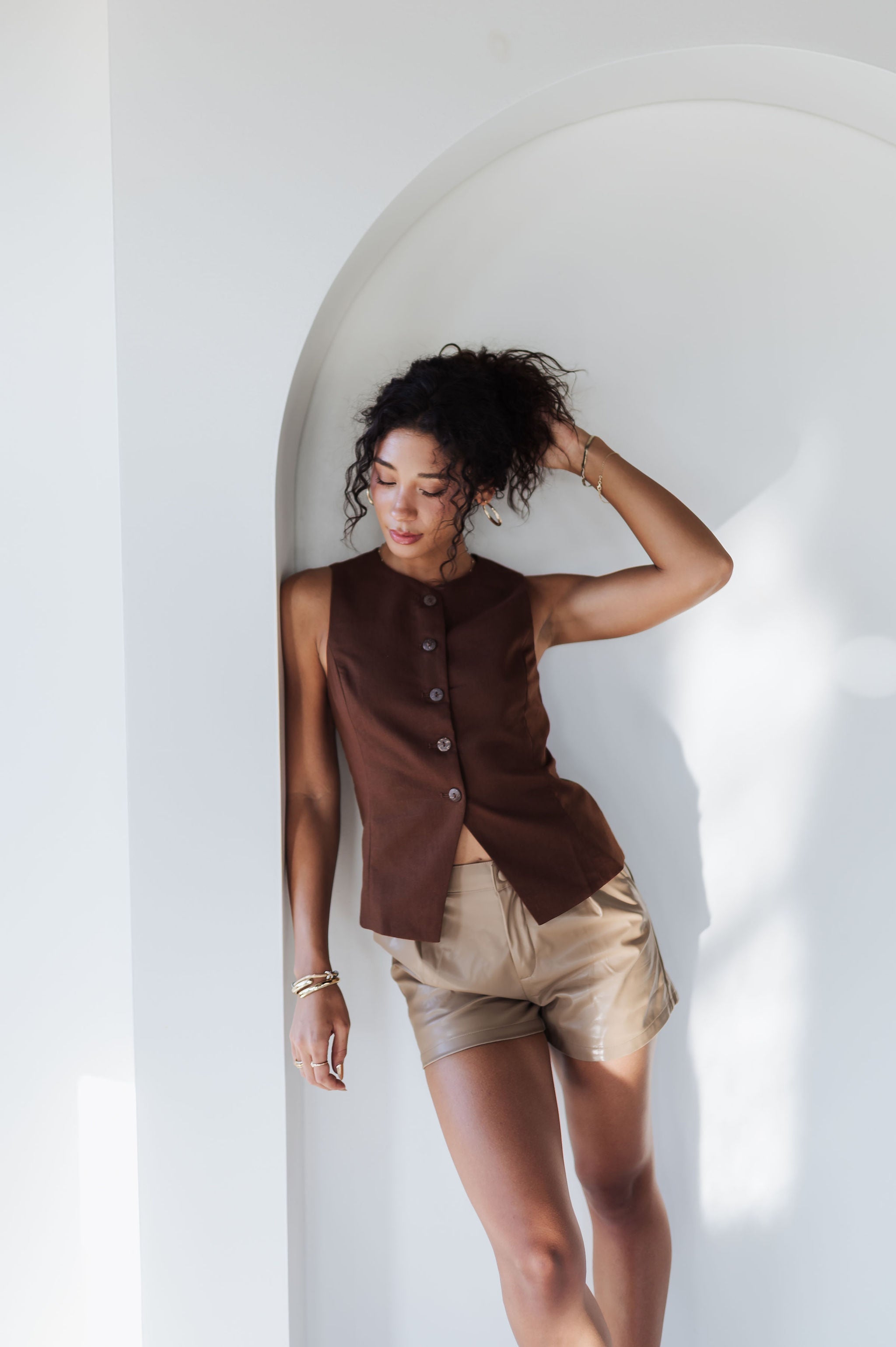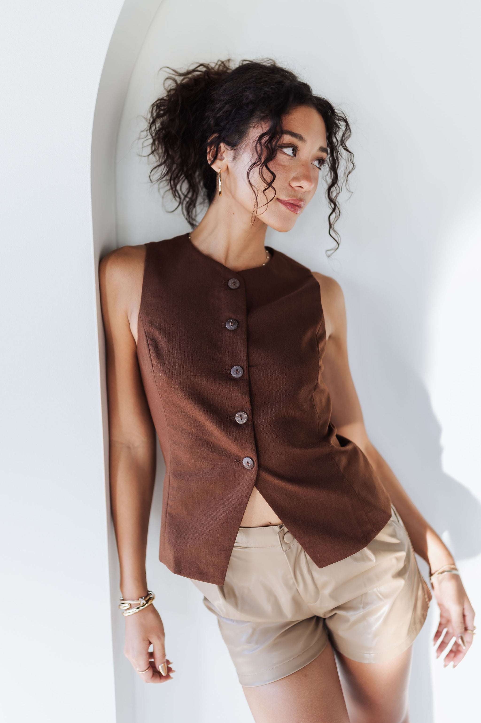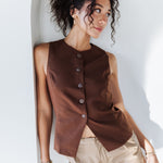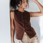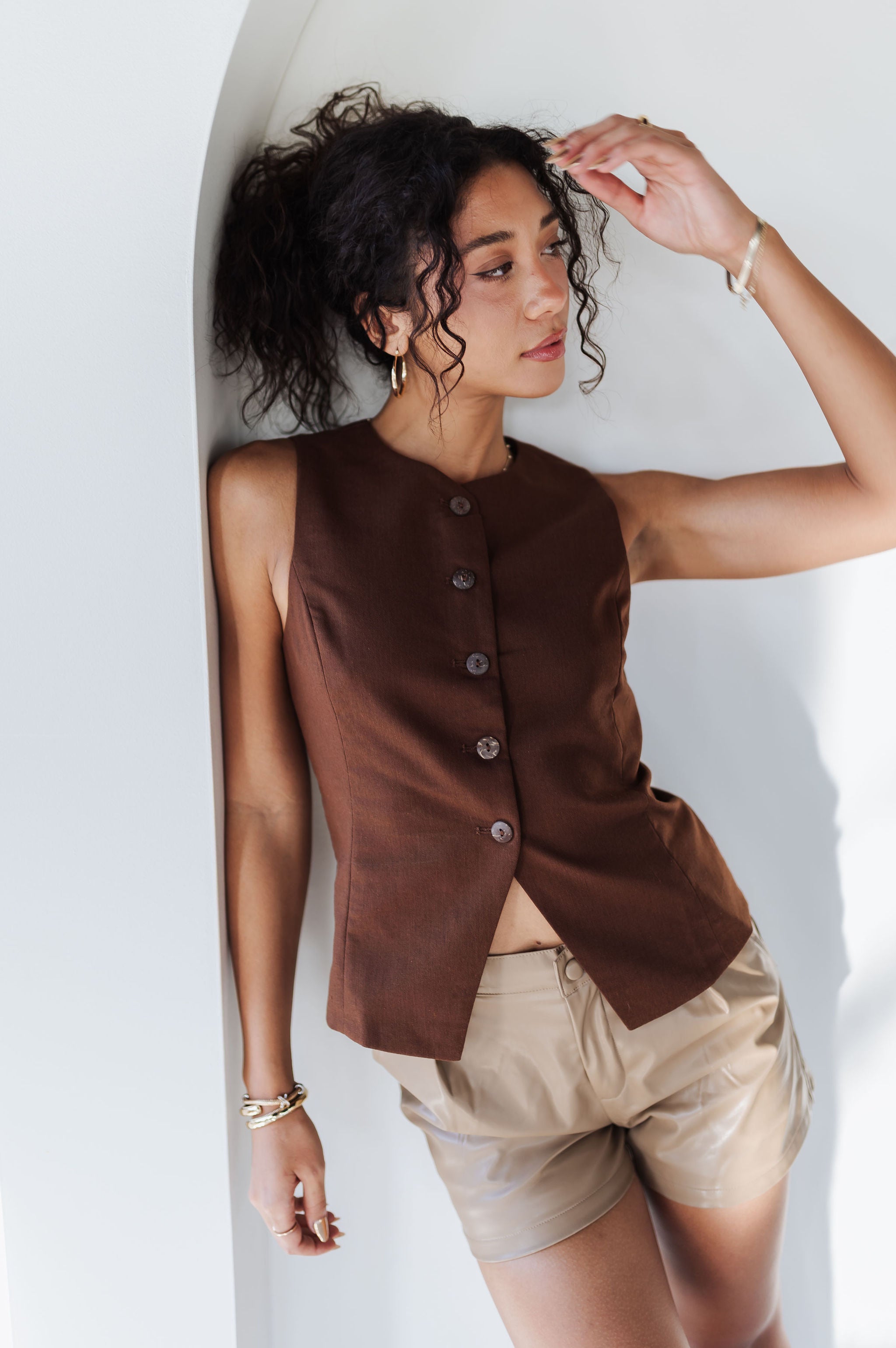 Elevate your everyday look with the Tailored Edge Vest Top, a sleek, sleeveless button-down vest that blends timeless tailoring with a modern edge. Whether styled solo or layered over your favorite blouse, this vest is the perfect mix of chic and versatile.