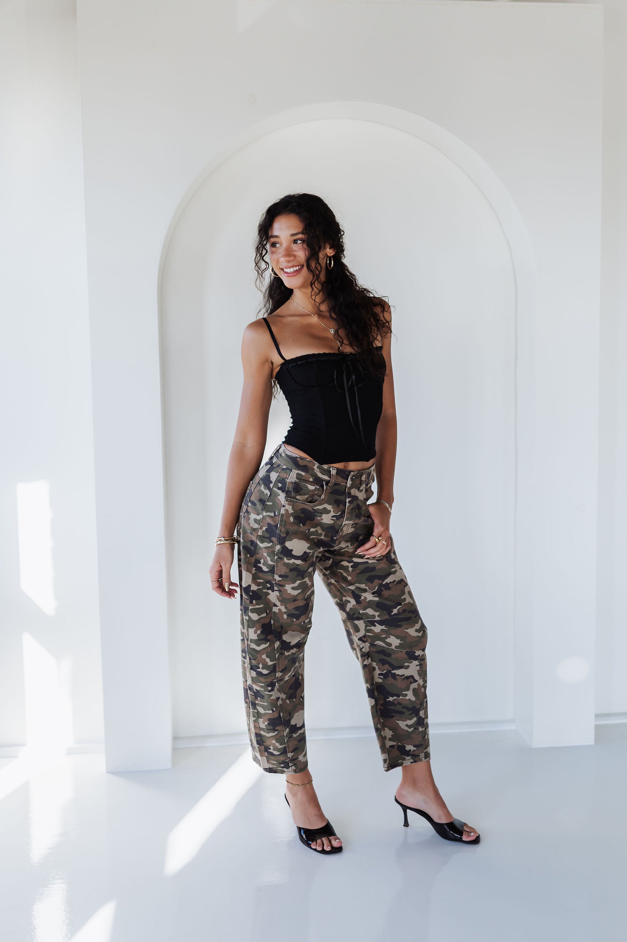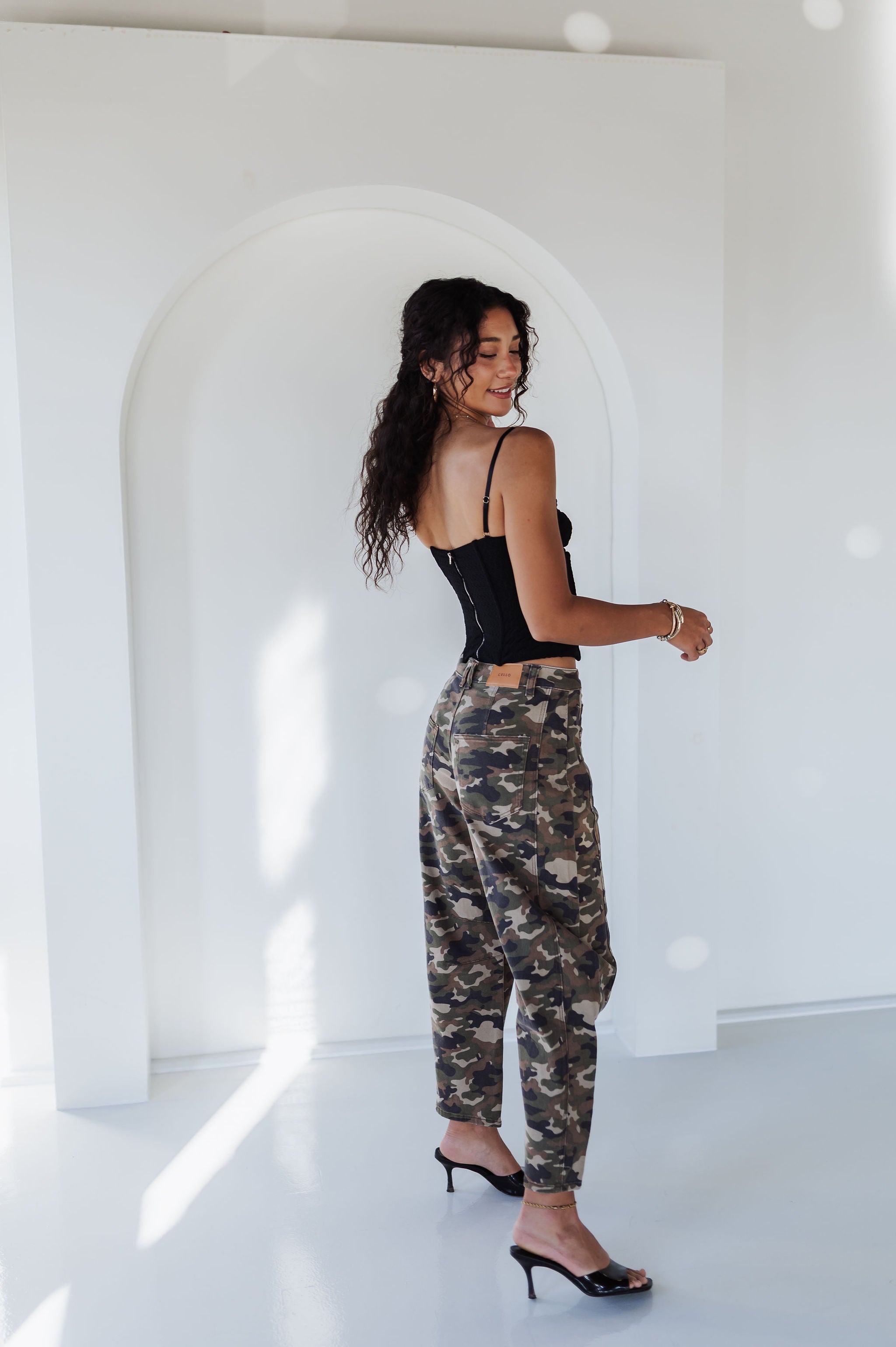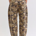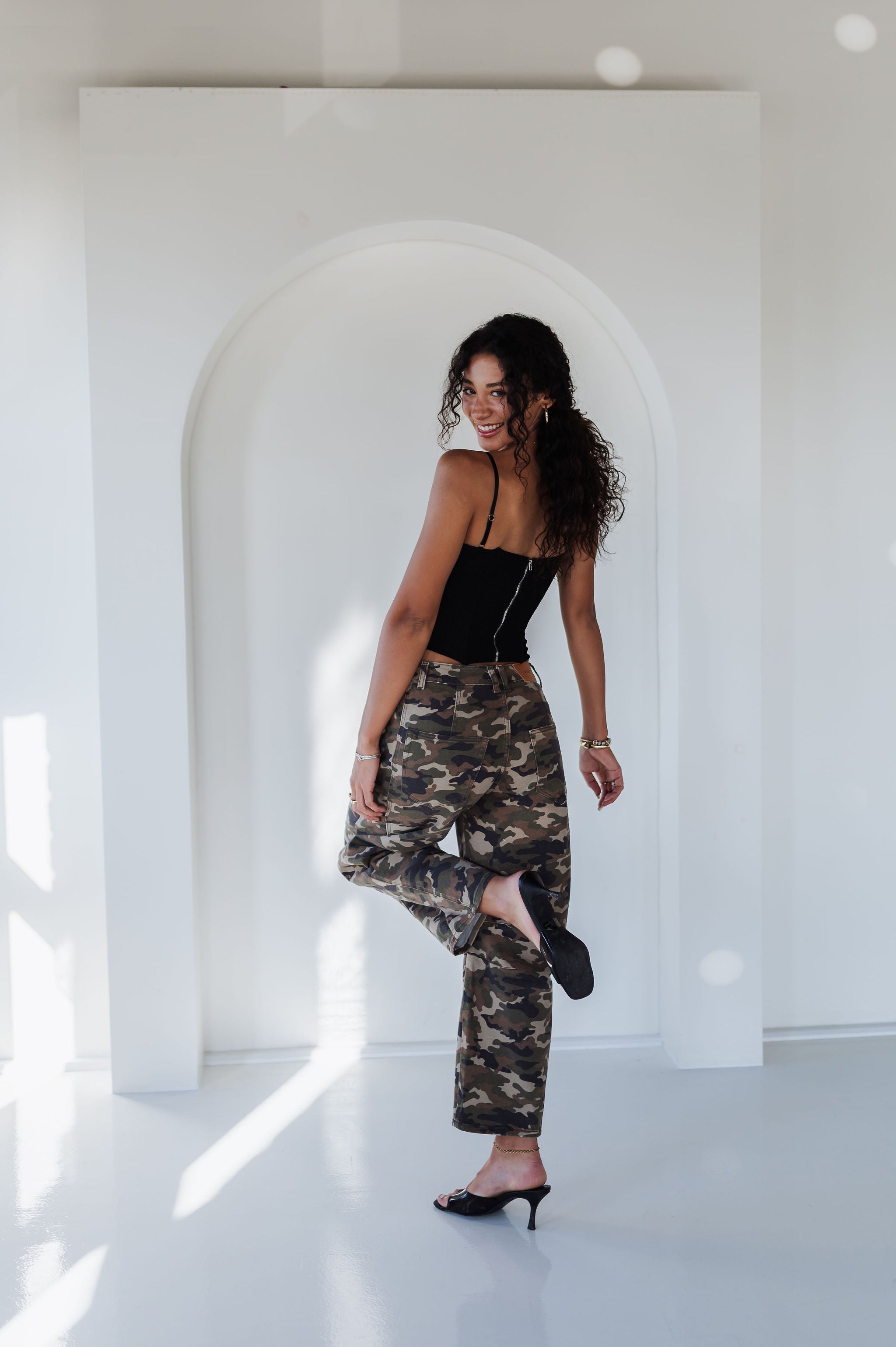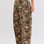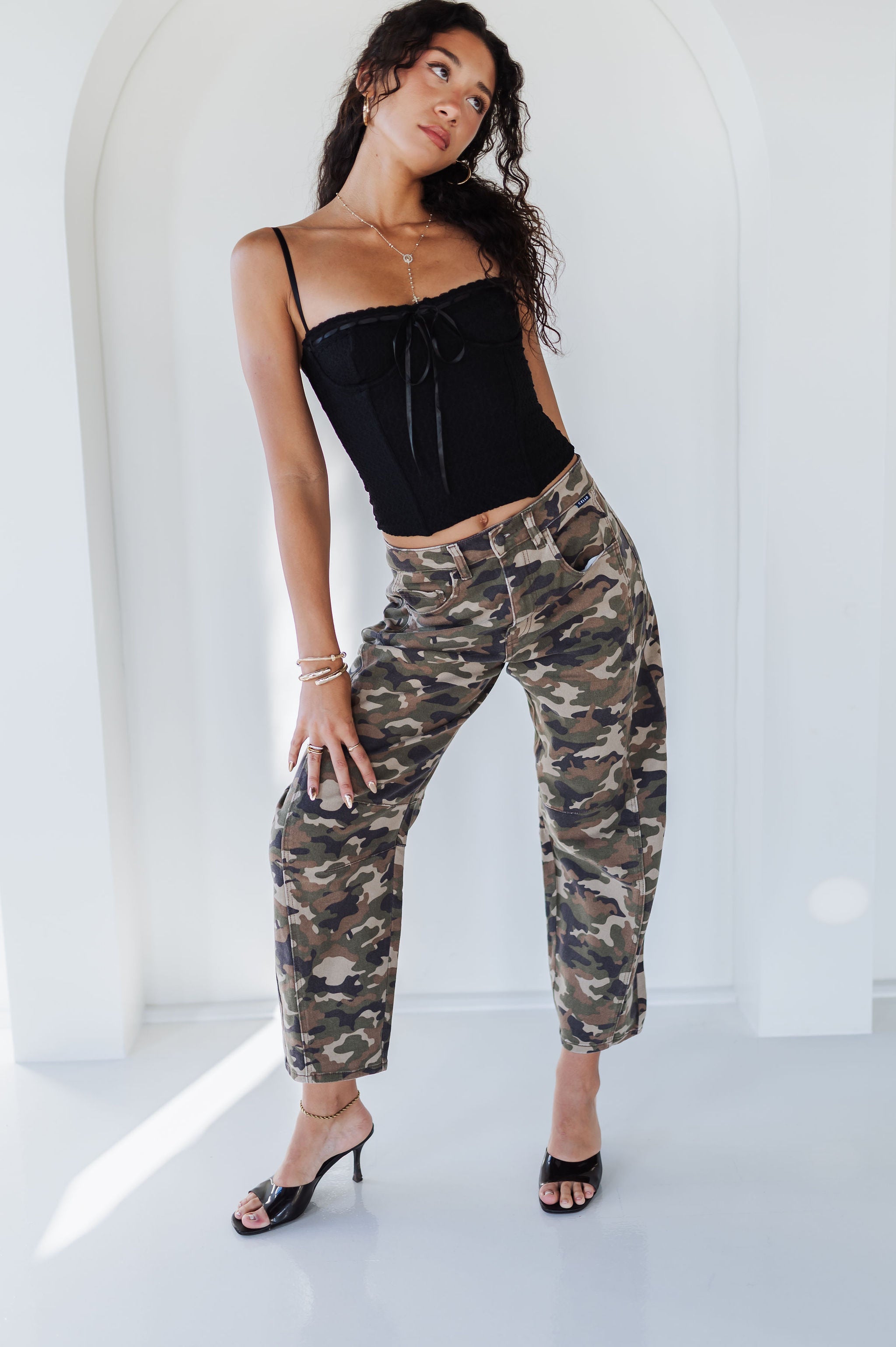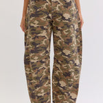 Stand out while blending in. The Urban Edge Camo Barrel Jeans put a modern twist on a classic print with their mid-waisted fit and relaxed barrel-leg silhouette. Designed with dart details for subtle structure and crafted in a soft, washed camo denim with a hint of stretch, these jeans balance laid-back comfort with bold style. Perfect for streetwear vibes or everyday casual looks.