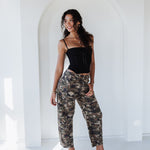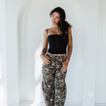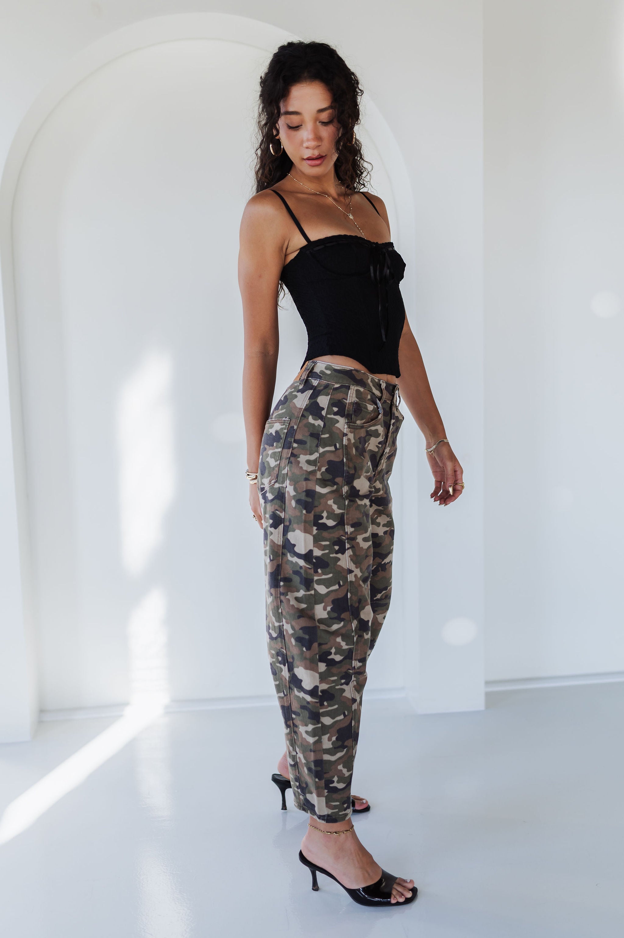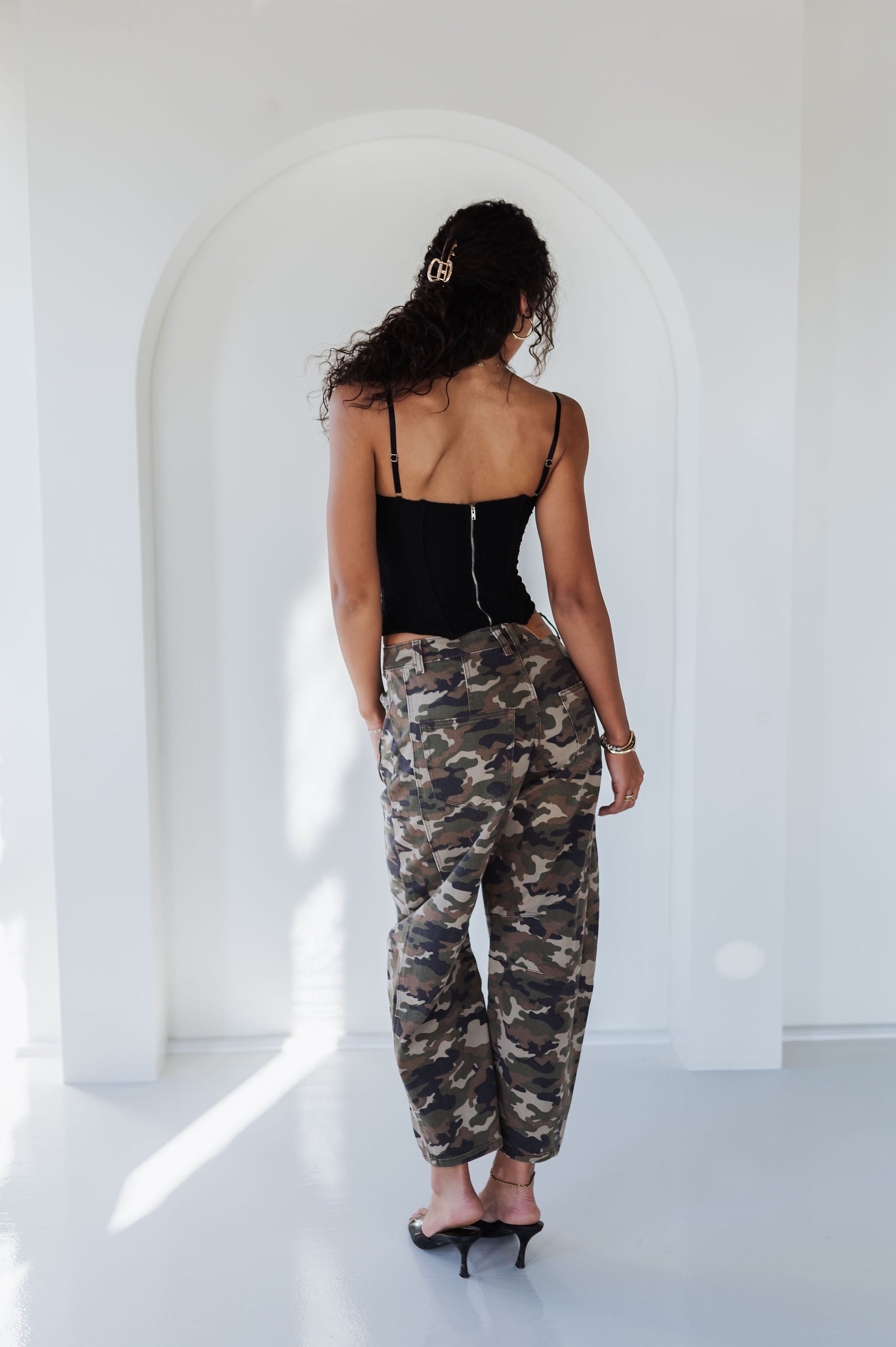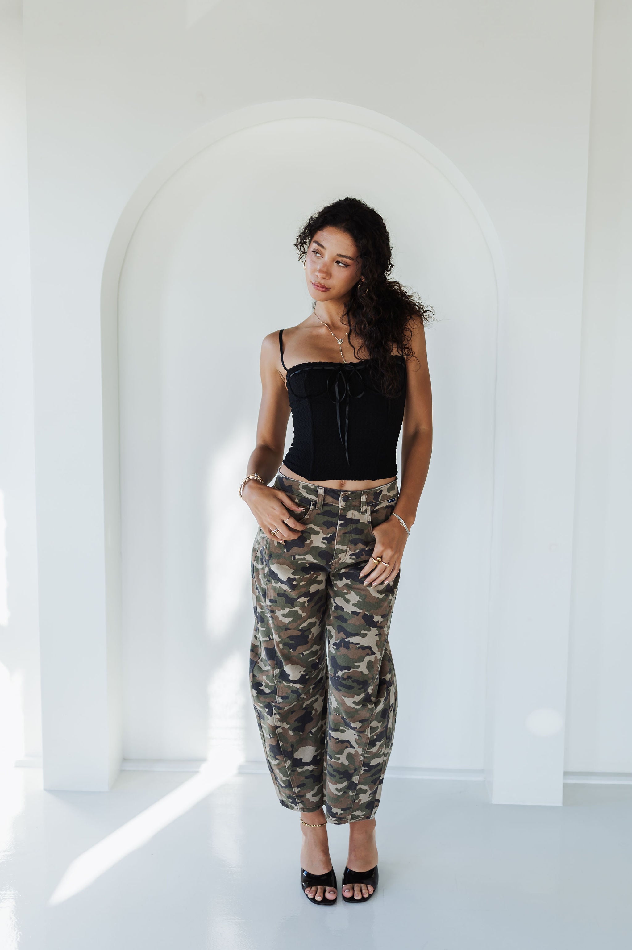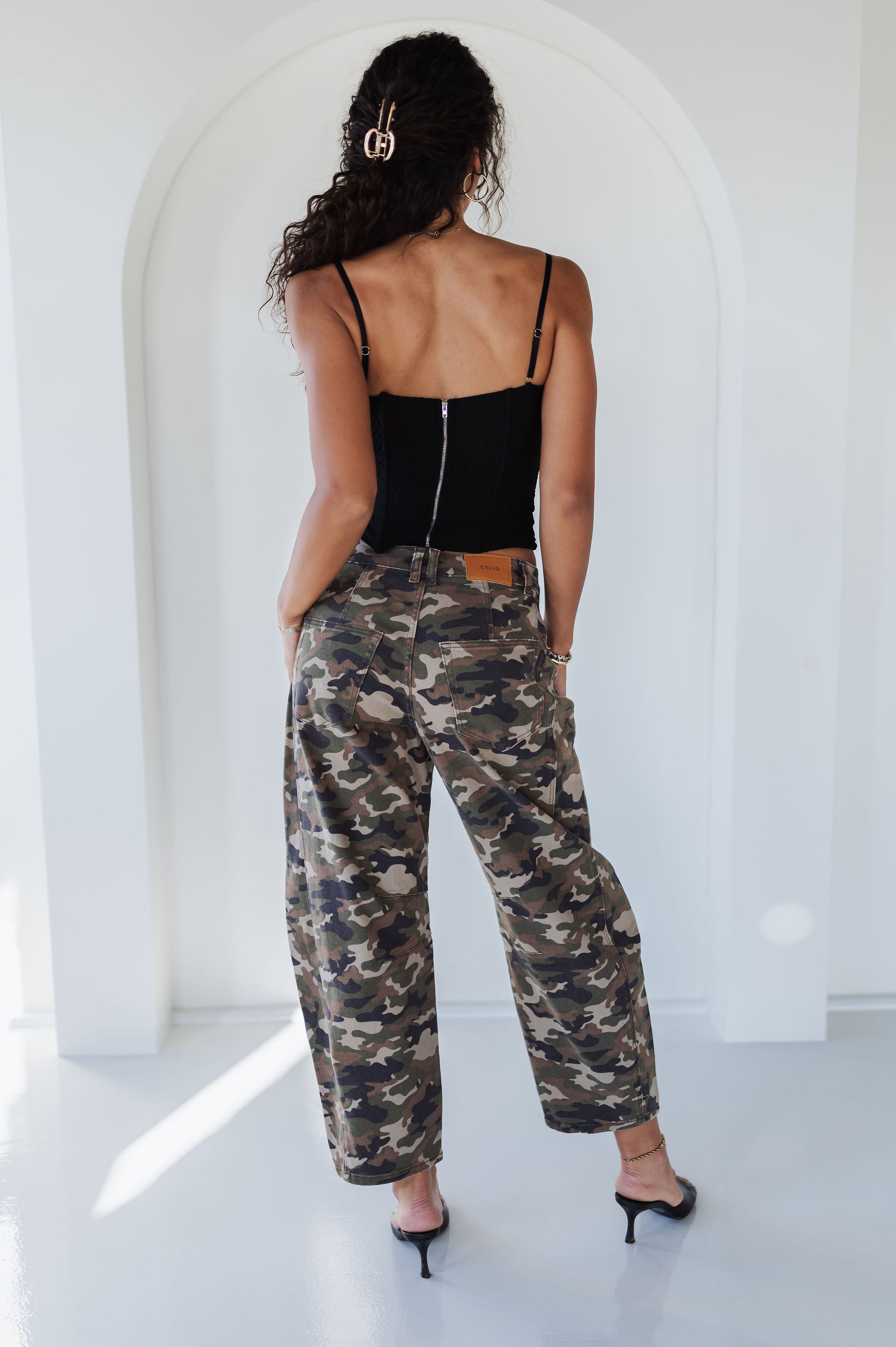 Stand out while blending in. The Urban Edge Camo Barrel Jeans put a modern twist on a classic print with their mid-waisted fit and relaxed barrel-leg silhouette. Designed with dart details for subtle structure and crafted in a soft, washed camo denim with a hint of stretch, these jeans balance laid-back comfort with bold style. Perfect for streetwear vibes or everyday casual looks.