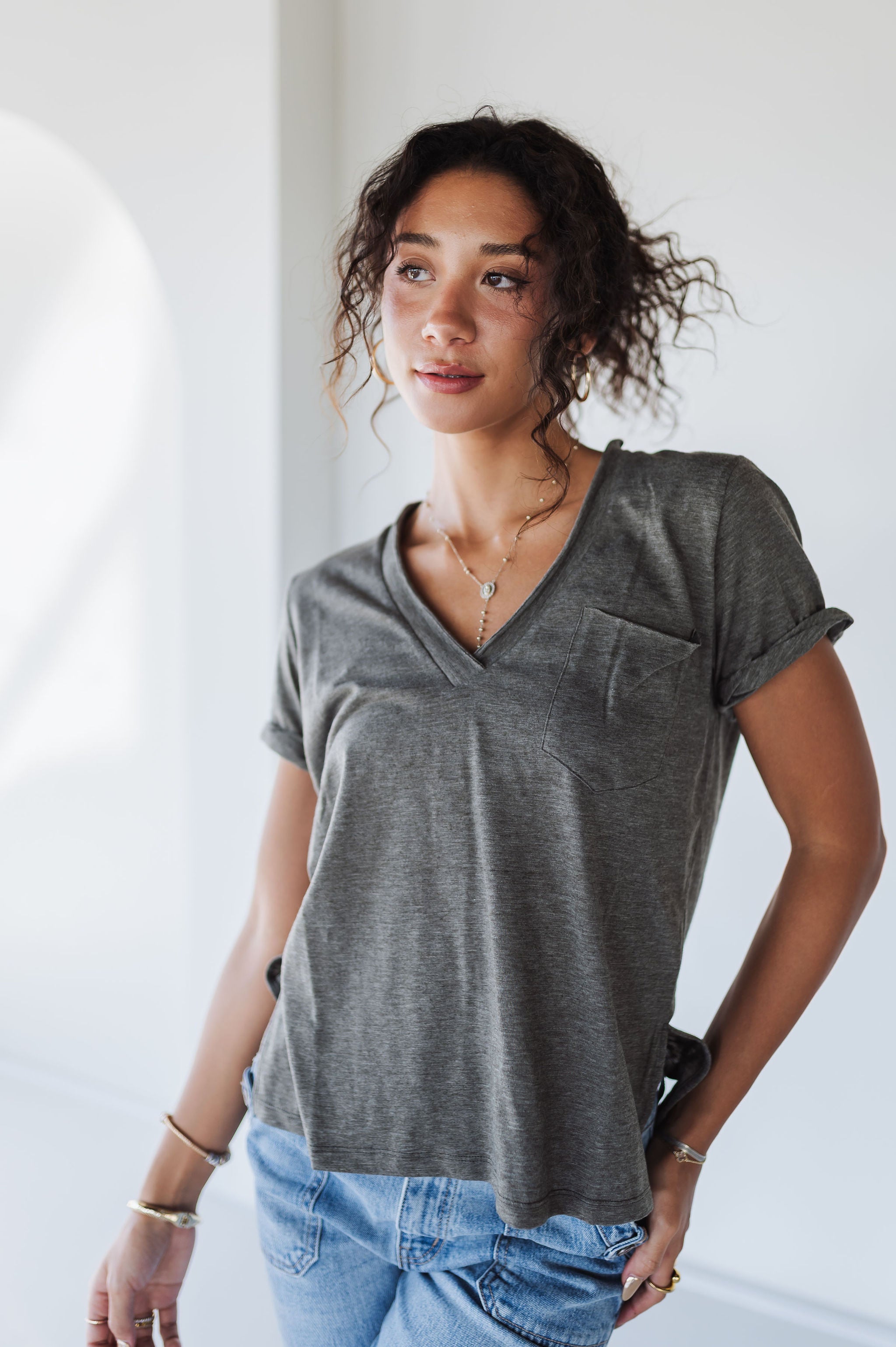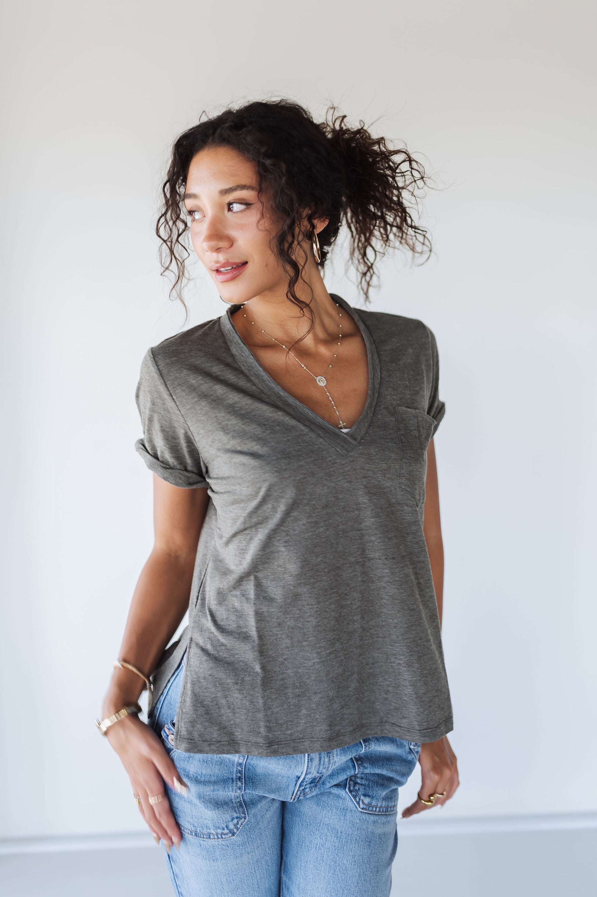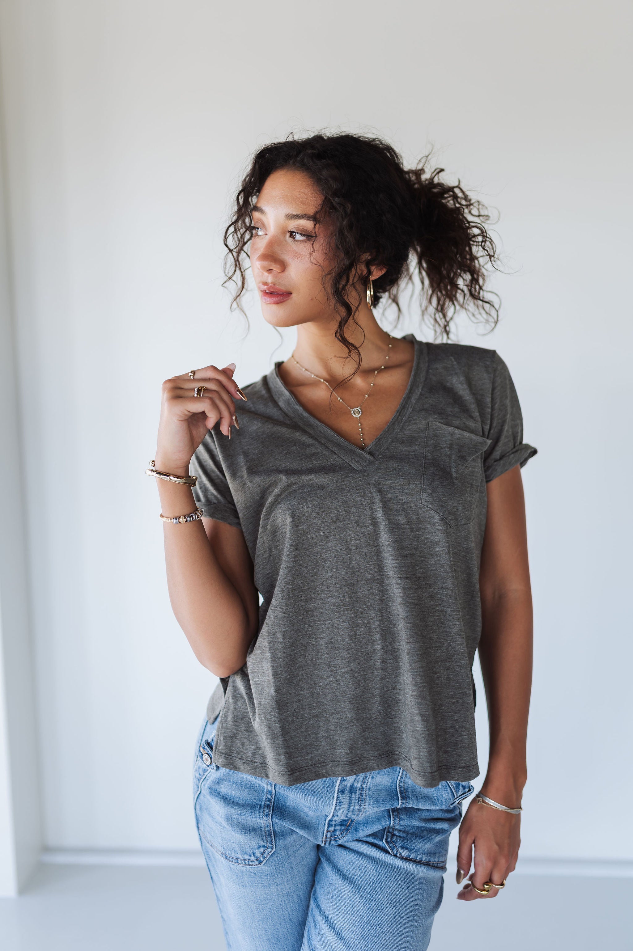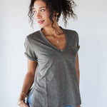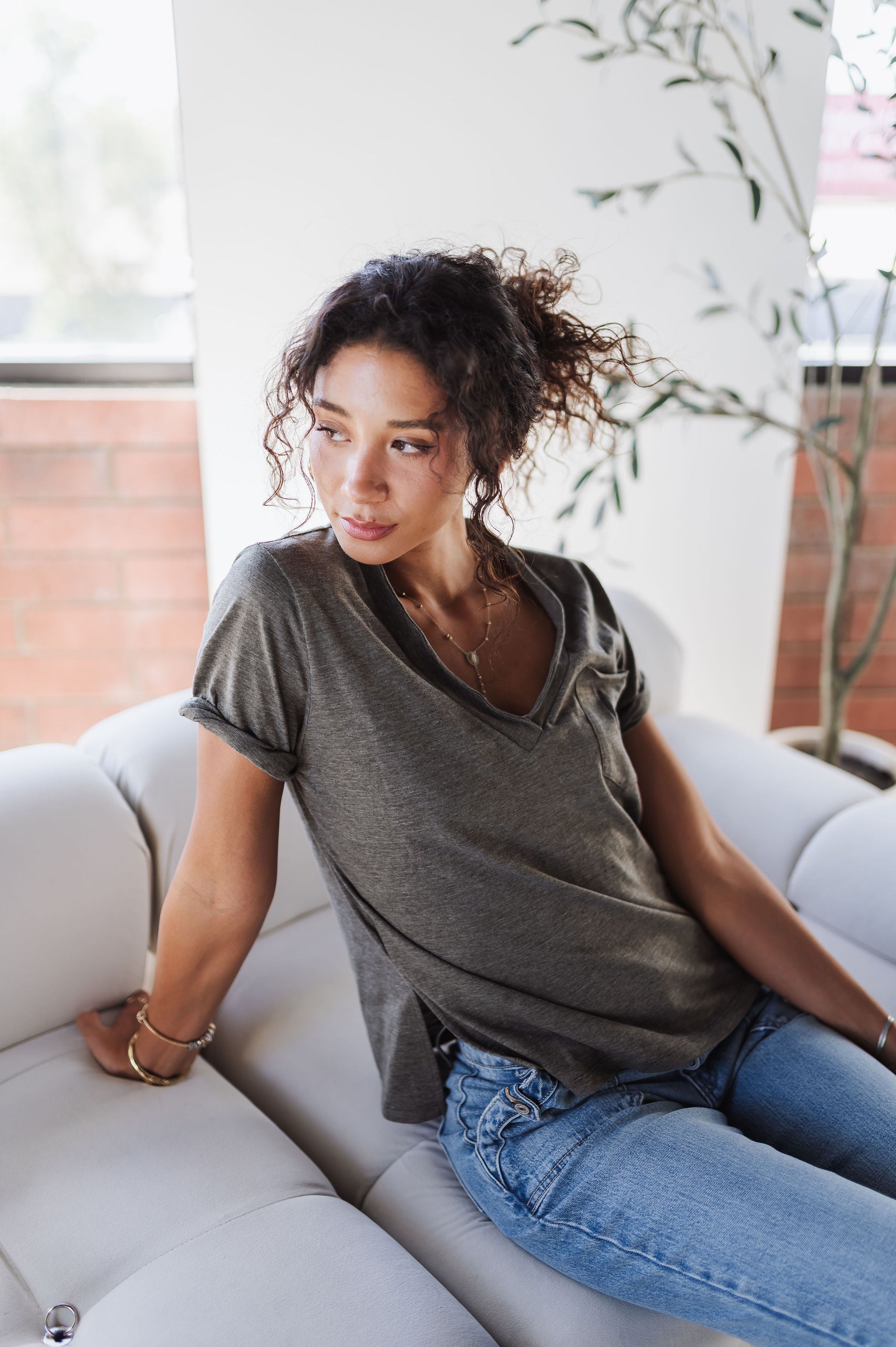 Meet your new everyday essential: the Zoie Heather Grey V-Neck Tee. Designed with a relaxed silhouette and lived-in softness, this tee is the perfect mix of casual comfort and effortless style.