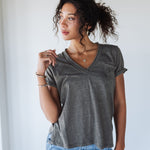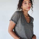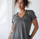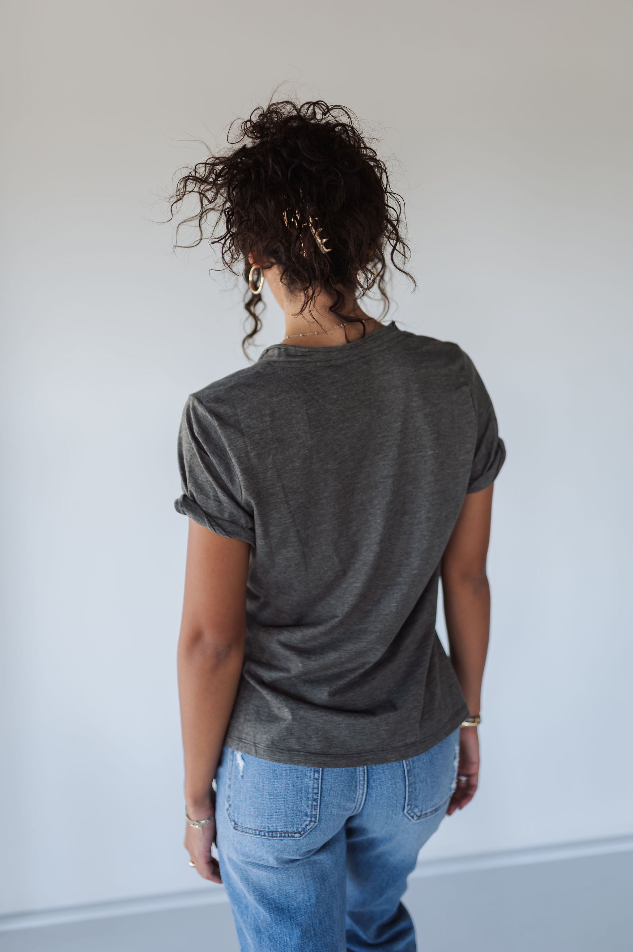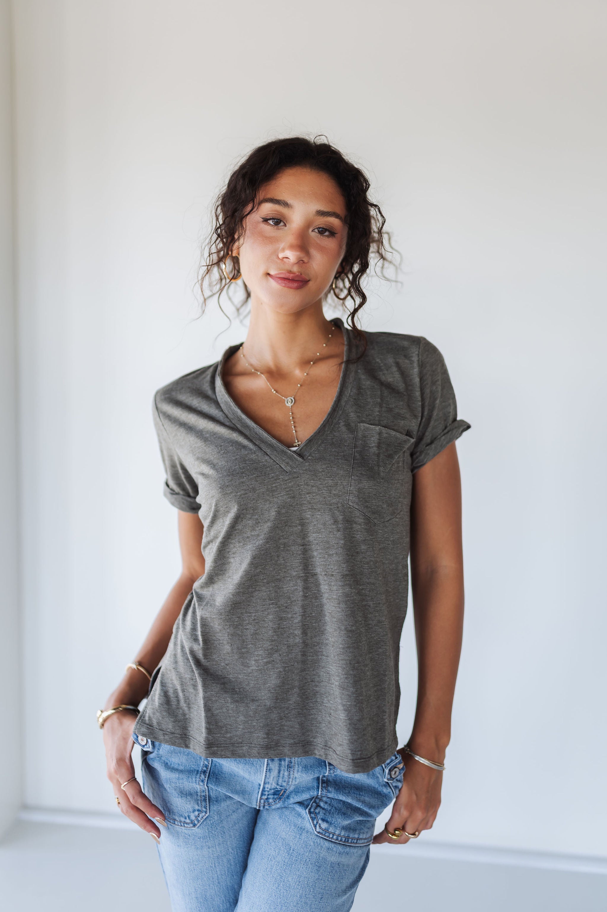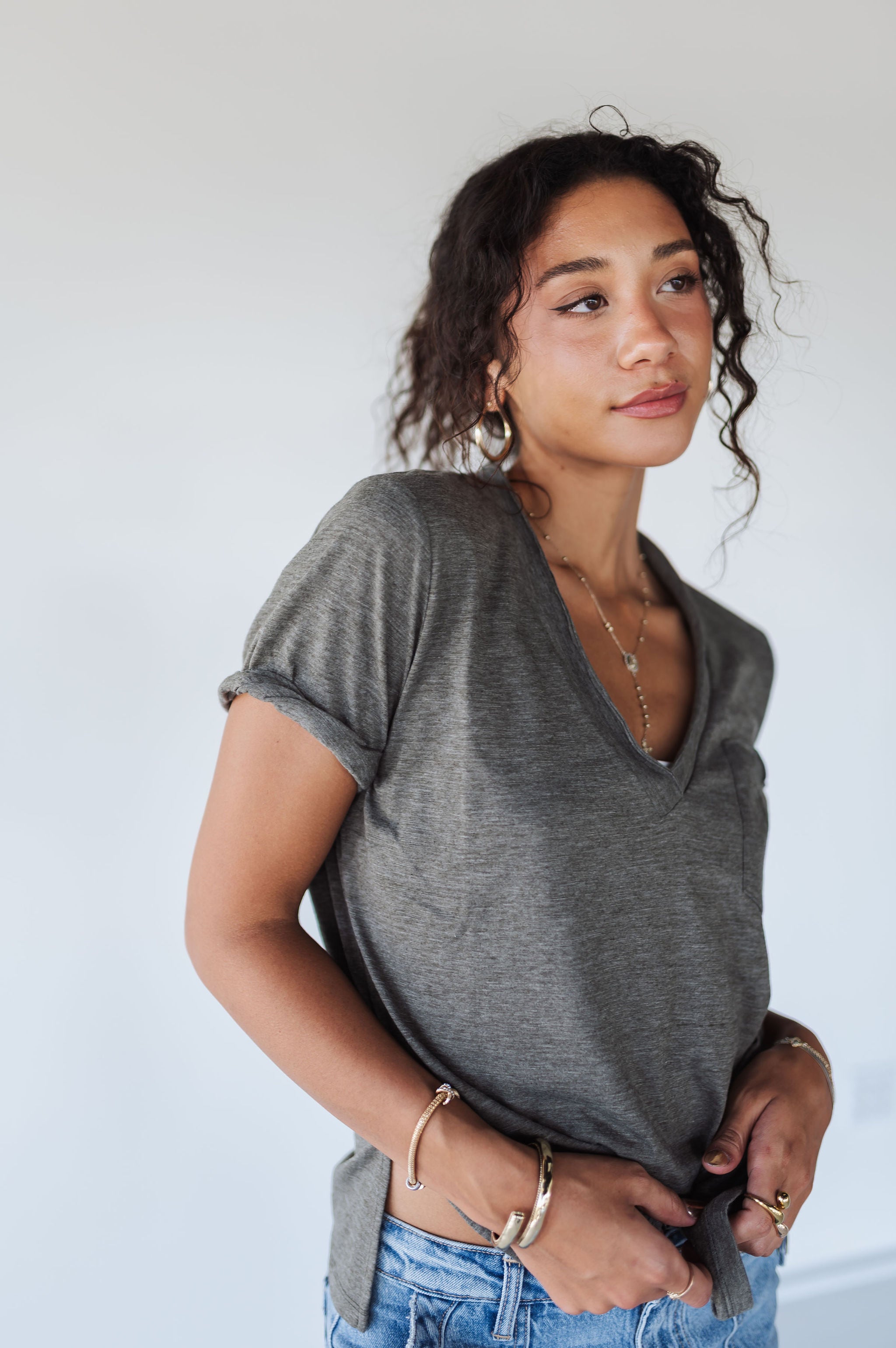 Meet your new everyday essential: the Zoie Heather Grey V-Neck Tee. Designed with a relaxed silhouette and lived-in softness, this tee is the perfect mix of casual comfort and effortless style.